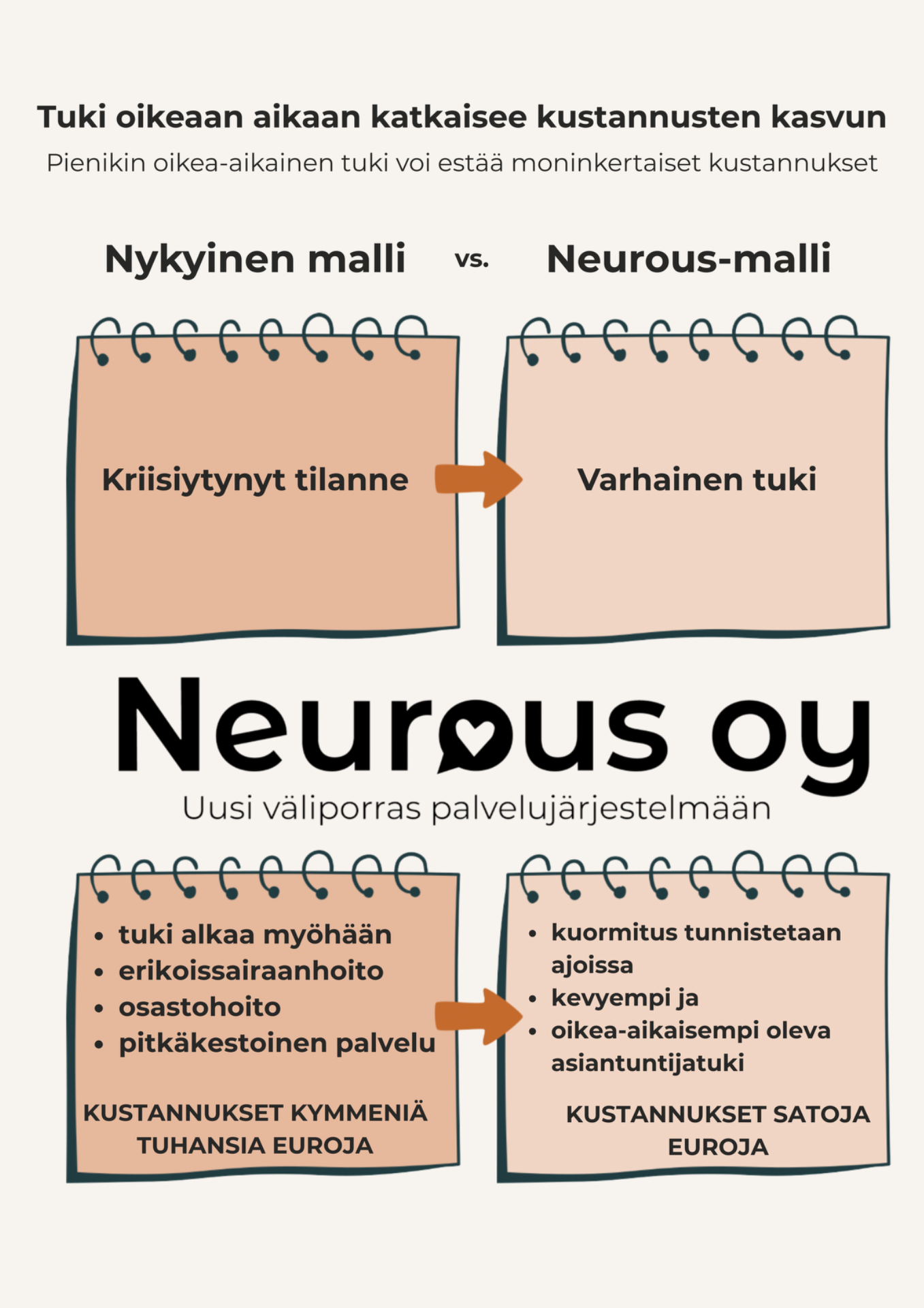 Neurous syntyi siitä havainnosta, että apu tulee liian usein vasta silloin, kun tilanne on jo kriisiytynyt. Sitä ennen on pitkä vaihe, jossa arki ei enää toimi – mutta tukea ei vielä saa. Me toimimme juuri tässä väliin jäävässä kohdassa.